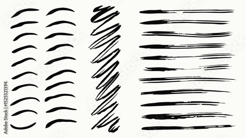 Collection of curved lines squiggles and straight brush strokes in black ink on a white background