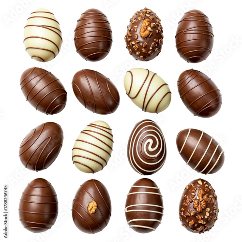 Collection of decadent chocolate easter eggs in various decorative styles isolated on transparent background