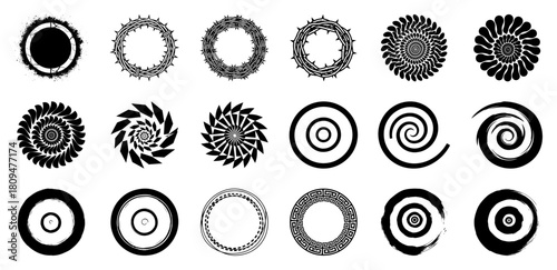 Collection of Decorative Circular Symbols Including Spirals Sun Shapes and Grunge Brush Strokes