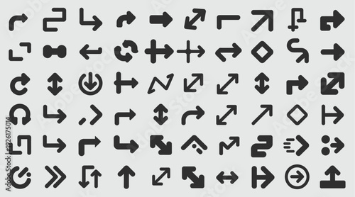 Collection of diverse black arrow icons and symbols on a neutral gray background, representing direction, movement, and navigation, perfect for web design and UI elements.