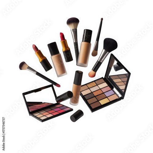 Collection of diverse makeup products and brushes artfully arranged isolated on transparent background