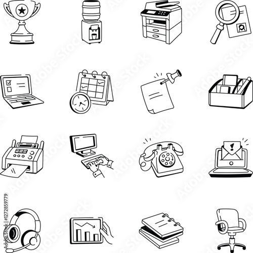 Collection of Doodle Style Office Equipment Icons