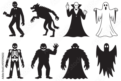 Collection of eight classic halloween monster silhouettes on white background