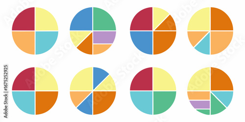 Collection of eight colorful pie charts with different segmentations and color schemes on a white background