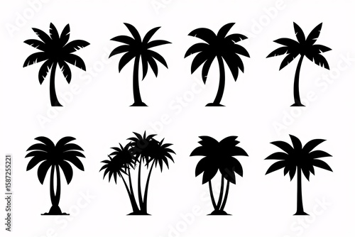 Collection of eight stylized black palm tree silhouettes; tropical, summer, vacation, design elements.