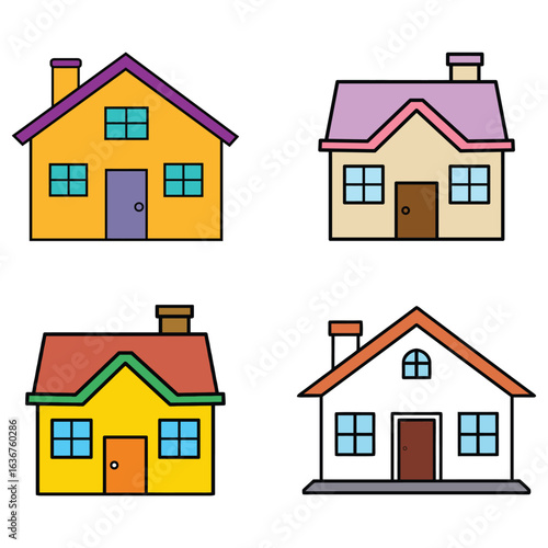 Collection of four colorful cartoon houses with chimneys