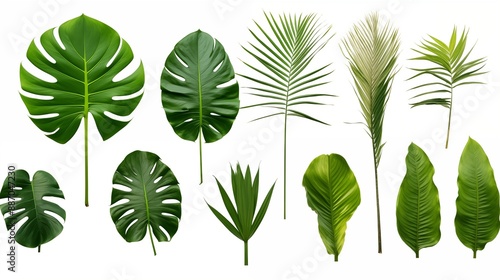 Collection of green leaves of tropical plants bush (Monstera, palm, rubber plant, pine, bird's nest fern). PNG, cutout, or clipping path.