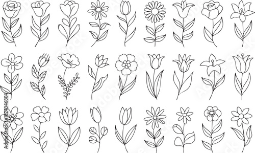 Collection of hand drawn black and white floral illustrations with various flower types and leaves