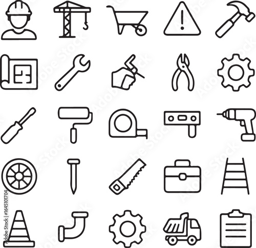 Collection of hand drawn construction and building tools icons representing various aspects of the building industry and diy projects