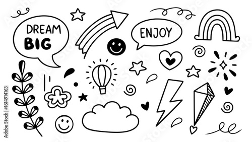 Collection of hand drawn doodle elements including inspirational words like dream big and enjoy with whimsical symbols