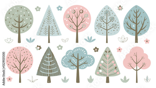 collection of hand drawn minimalist tree illustrations in pastel colors, featuring various tree shapes and decorative elements like flowers and leaves, creating whimsical and serene design