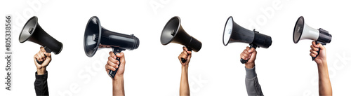 Collection of hand holding a megaphone png isolated on a transparent background, warning, news, loud, advertisement concept