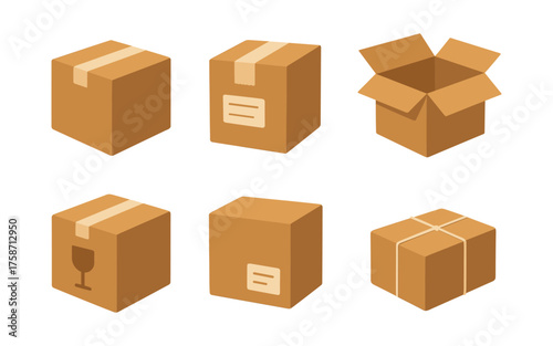 Collection of isometric cardboard boxes with varied designs and open lid
