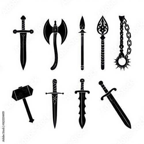 Collection of medieval weapons and armory, including swords, axe, spear, and mace, isolated on white background