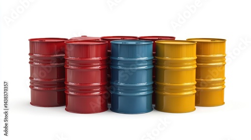 Collection of metal oil barrels in shades of red, blue, and yellow, viewed from the side on white background.