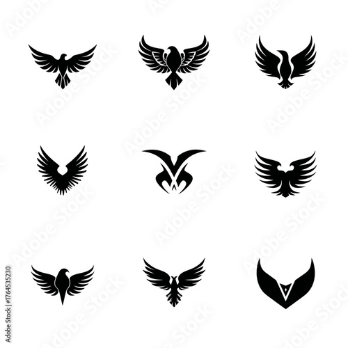 Collection of minimalist black vector eagle bird logos and icon designs, flying with spread wings, representing power, freedom, and strength.