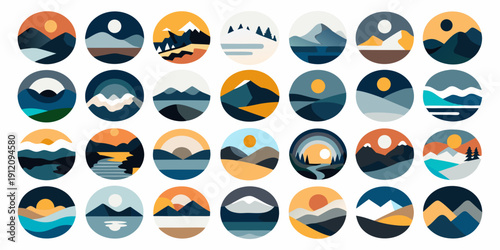 Collection of minimalist circular landscape illustrations with mountains sun and water