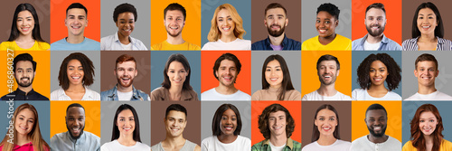 Collection of multiracial people smiling and feeling happy on colorful studio backgrounds. Human mosaic concept