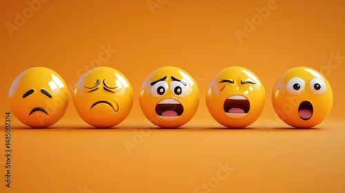 collection of nine 3D emoticons arranged on a bright orange background, each expressing different emotions: happiness, sadness, surprise, anger, fear, love, excitement, boredom, and frustration.