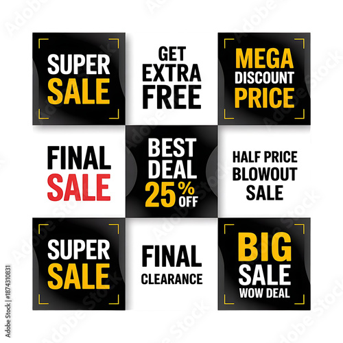 Collection of nine different retail sale promotion announcement banners with various discount messages and sale labels