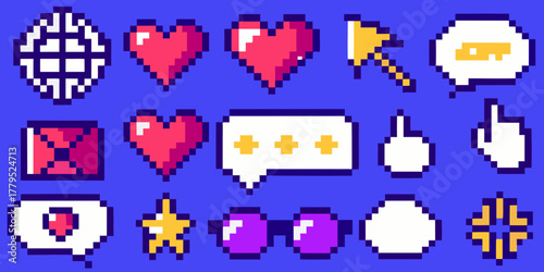 Collection of pixel art icons for user interface design and online communication elements