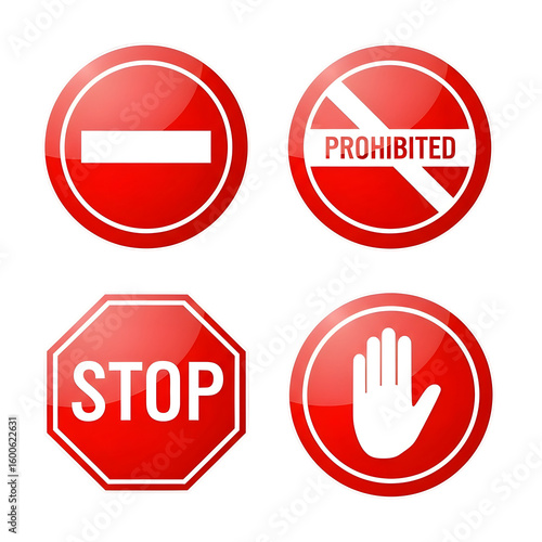 Collection of Red and White Prohibition Signs: Stop, Do Not Enter, Prohibited, and No Hand Signals, Illustrating Clear Restrictions and Safety Measures