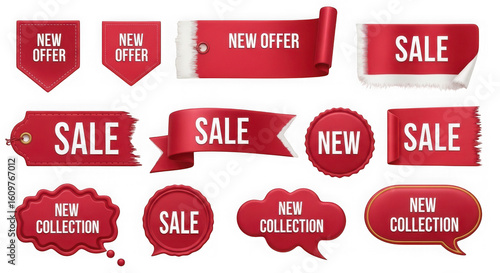 Collection of red sale and new offer labels and tags