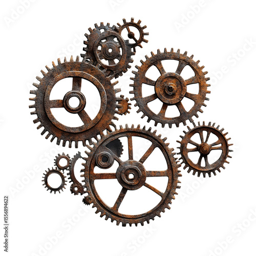 Collection of rusty metal gears interconnected isolated on transparent background