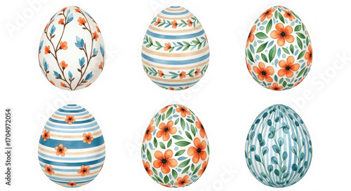 Collection of six decorative easter eggs with floral and striped patterns, isolated on transparent background