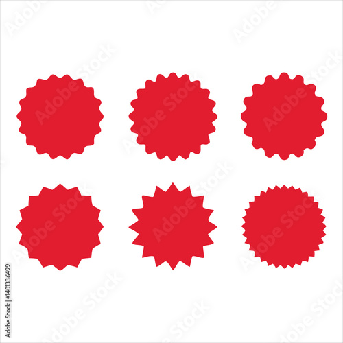 Collection of six red starburst shapes, perfect for badges, labels, and promotional designs, offering versatile design elements for various projects.