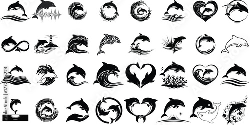 Collection of stylized black and white dolphin silhouettes and designs for marine themed projects