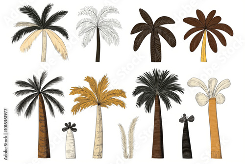 Collection of stylized palm tree illustrations with various leaf shapes and trunk textures, set against a white background.