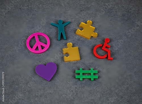 Collection of symbolic icons peace disability heart human shape puzzle pieces representing diversity inclusion and equality