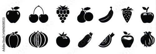 Collection of various fresh fruits and vegetables black silhouette on white background healthy eating vector graphic element