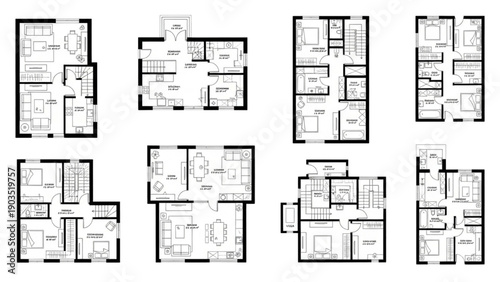 Collection of various house floor plans displayed in a grid layout showcasing different architectural designs