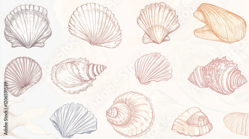 Collection of various seashells, hand-drawn style.