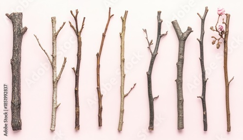 Collection of Various Twigs and Branches Isolated on a Soft Pink Background for Nature-Themed Designs and Backgrounds