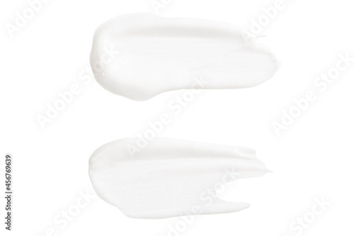 Collection of White Cosmetic Cream Isolated on White Background. Set of Lipstick Smear. Lip Gloss Smudge. Cosmetics BB Makeup Swatche. Drop of Liquid Foundation Stroke. Skin Tone CC Cream Tear Shape