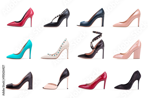 Collection of women's high-heeled shoes. A collection of women's high-heeled shoes. A group of diverse female shoes on a white background.