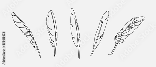 Collection one line drawing of feather, quill pen. Editable line. Vector illustration.