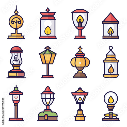Collection various street lamps lanterns vector illustration. Colorful icons set outdoor lighting fixtures design elements. Different styles classic modern lamps isolated white background