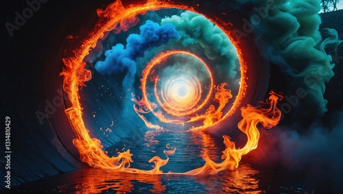 Color smoke circle. Ink water swirl. Fire flame vortex. A circular tunnel of orange, red, and yellow fumes on a dark abstract backdrop.