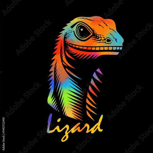 colored Lizard head on black background. hand drawing. Not AI, Vector illustration.