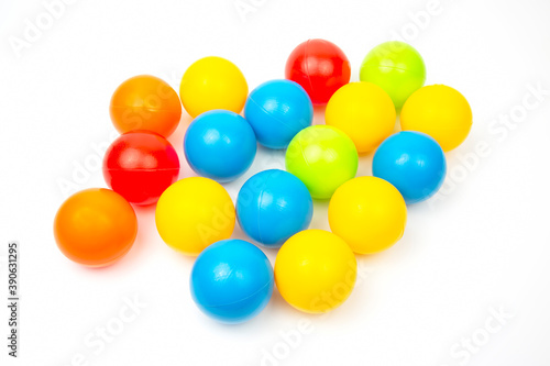 Colored plastic balls on white background. leisure and game items. round objects