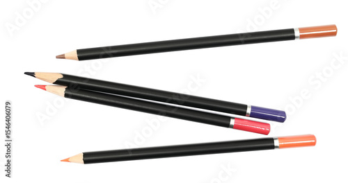 colorful wooden crayons isolated on white, top view
