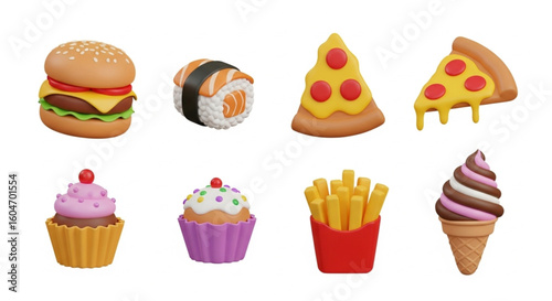 Colorful 3D Cartoon Fast Food Icons – Burger, Sushi, Pizza & More (Playful Vector Set)