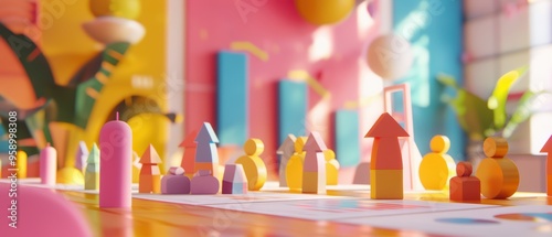 Colorful 3D geometric shapes arranged on a vibrant table, showcasing creativity and playful design in a bright environment.