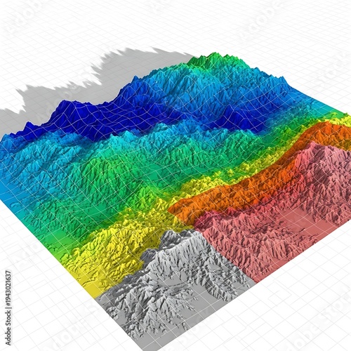 Colorful 3D topographic map illustration depicting mountain ranges and valleys with a grid overlay representing elevation changes