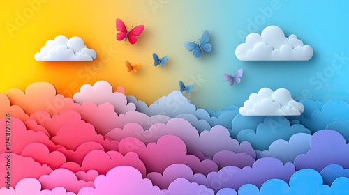 Colorful abstract background featuring stylized clouds and butterflies in a gradient sky