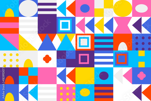 Colorful abstract geometric pattern with squares, circles, triangles, and lines
